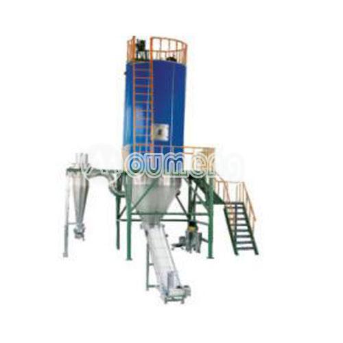 壓力噴霧干燥機是一種可以同時完成干燥和造粒的裝置。按工藝要求可以調節(jié)料液泵的壓力,流量,噴孔的大小,得到所需的按一定大小比例的球形顆粒。其工作過程為料液通過隔膜泵高壓輸入,噴出霧狀液滴,然后同熱空氣并流下降,大部分粉粒由塔底排料口收集,廢氣及其微小粉末經旋風分離器分離,廢氣由抽風機排出,粉末由設在旋風分離器下端的授粉筒收集,風機出口處還可裝備二級除塵裝置,回收率在96-98%以上。其與物料接觸部分的塔體、管道、分離器的材料,均采用SUS304制作。在塔體內部與外殼之間有足夠的保溫層,填充材料為超細玻璃棉,塔體設有觀察門、視鏡、光源及控制儀表,由電氣控制操作臺控制和顯示。其熱源裝置采用蒸汽加熱或電加熱器,具有操作方便、啟動快、結構緊湊、熱風干凈清潔等優(yōu)點。另外在電氣控制柜內裝有電加熱器的控制調節(jié)裝置,使進口溫度無級調節(jié)。對于缺電地區(qū)可采用蒸汽加熱或燃煤、燃油熱風爐等方式,局部或全部代替電加熱裝置。