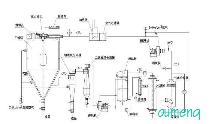 閉式循環(huán)噴霧干燥機系統(tǒng)由噴霧干燥機主機、帶空氣過濾器的加熱器、鼓風(fēng)機、水氣分離器、大小冷卻塔、噴淋塔、排風(fēng)機、一級旋風(fēng)分離器、二級旋風(fēng)分離器、泵、測氧儀以及管路與控制閥等組成。